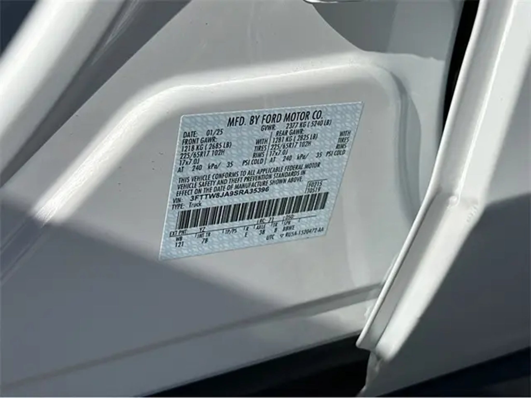 - VIN #3FTTW8JA9SRA35396